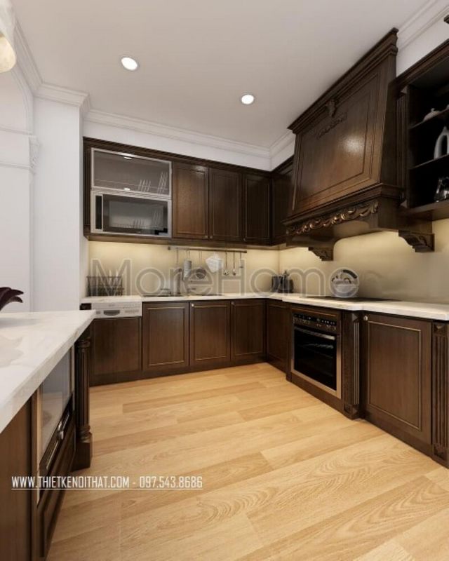 Thiết kế phòng bếp chung cư cao cấp với hệ tủ bếp gỗ tự nhiên cao cấp mang đến không gian nấu ăn lí tưởng cho các chi em nội trợ.