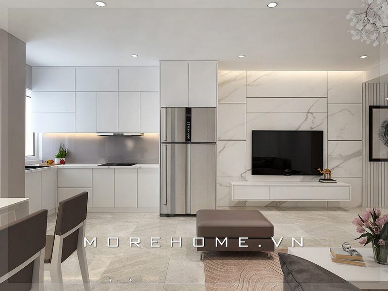 Thiết kế nội thất phòng bếp chung cư và bàn ăn liền kề không tạo vách ngăn chặn đứng vì vậy tạo cảm giác thoải mái và dễ chịu cho không gian sinh hoạt chung của gia chủ