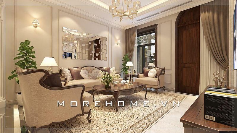 Nhà của bạn được thiết kế với những chi tiết tinh tế và đặc trưng của phong cách tân cổ điển, từ đường chỉ phào đến bộ bàn ghế sofa phòng khách. Chân ghế gỗ tự nhiên uốn lượn mềm mại, tạo nên một không gian sang trọng và tinh tế.