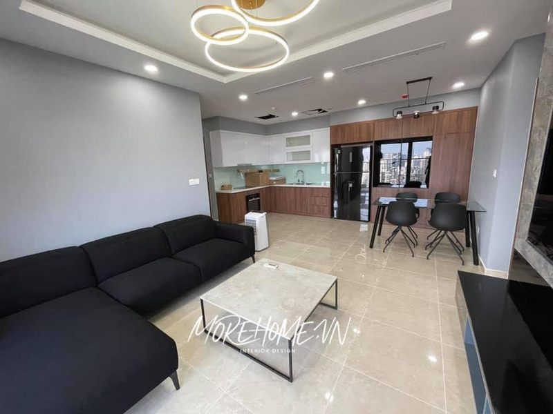 Ghế sofa màu tối kết hợp với mặt nền đá hoa sáng góp phần tạo nên nét đẹp cho căn phòng.