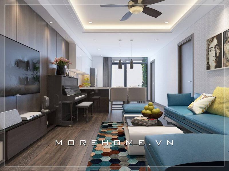 Bằng cách kết hợp màu sắc xanh nổi bật, bạn sẽ tạo ra một không gian phòng khách chung cư nhẹ nhàng và sang trọng.