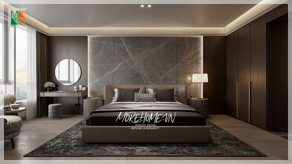 Giường ngủ bọc da màu nâu hiện đại được đặt chính không gian phòng, mang tới sự nghỉ ngơi, thư giãn những giấc ngủ ngon.