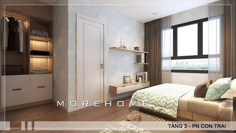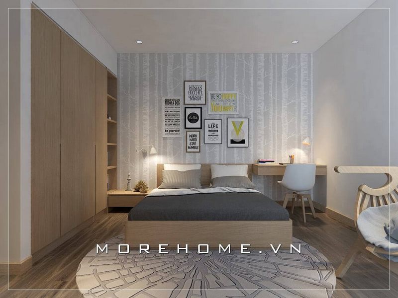 Thiết kế phòng ngủ chung cư nhỏ hiện đại, tủ quần áo kịch trần âm tường đã tận dụng triệt để được góc khuất căn phòng tạo cho căn phòng thêm phần thông thoáng hơn