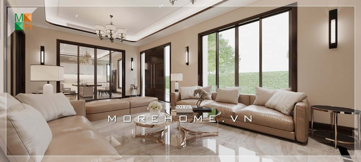 Bố trí nội thất phòng khách theo phong cách tân cổ điển tạo nên một không gian ngôi nhà hết sức tinh tế và không kém phần sang trọng